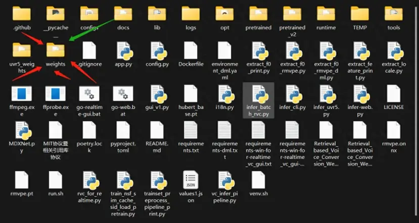 将下载好的声音模型文件,放置到 RVC目录下的 weights 目录下